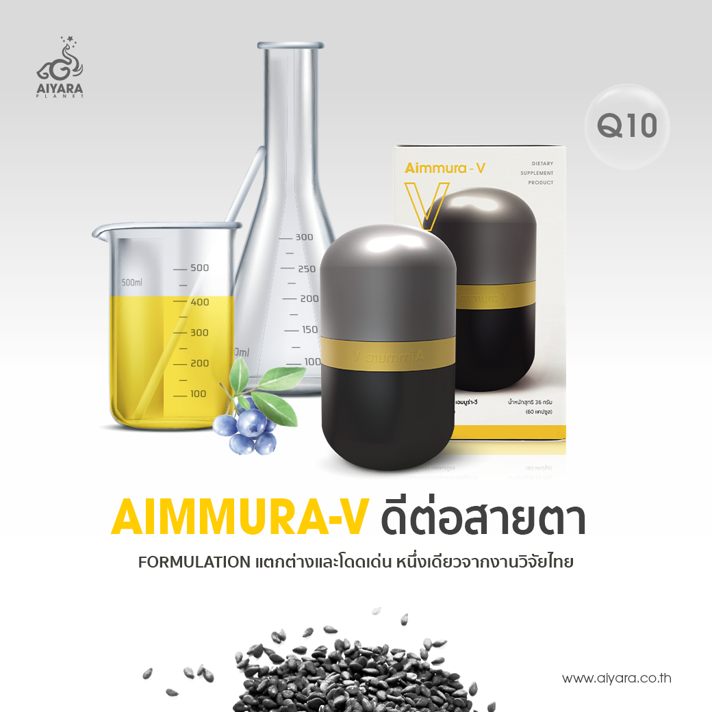AIMMURA – V หนึ่งในผลิตภัณฑ์งานวิจัยซีรีย์ AIMMURA ที่ได้ออกแบบมาเป็น Formulation สูตรอาหารสำหรับการมุ่งเน้นดูแลและถนอมดวงตาโดยเฉพาะ เป็นงานนวัตกรรมวิจัยระดับชีวโมเลกุล โดย ศ.ดร.ปรัชญา คงทวีเลิศ ทีมนักวิจัย มหาวิทยาลัยเชียงใหม่ ที่ได้คิดค้นและพัฒนาสูตรอาหารเฉพาะนี้ โดยการนำสารสกัดจากธรรมชาติ คือ สารสกัดเซซามีนจากงาดำ รำข้าวสีนิล ข้าวหอมมะลิ บิลเบอร์รี่ และโคเอนไซม์ คิวเท็น หลอมรวมคุณค่าของสารสกัดต่างๆ เพื่อมุ่งเน้นการดูแลสุขภาพดวงตาเป็นหลักสำคัญ
